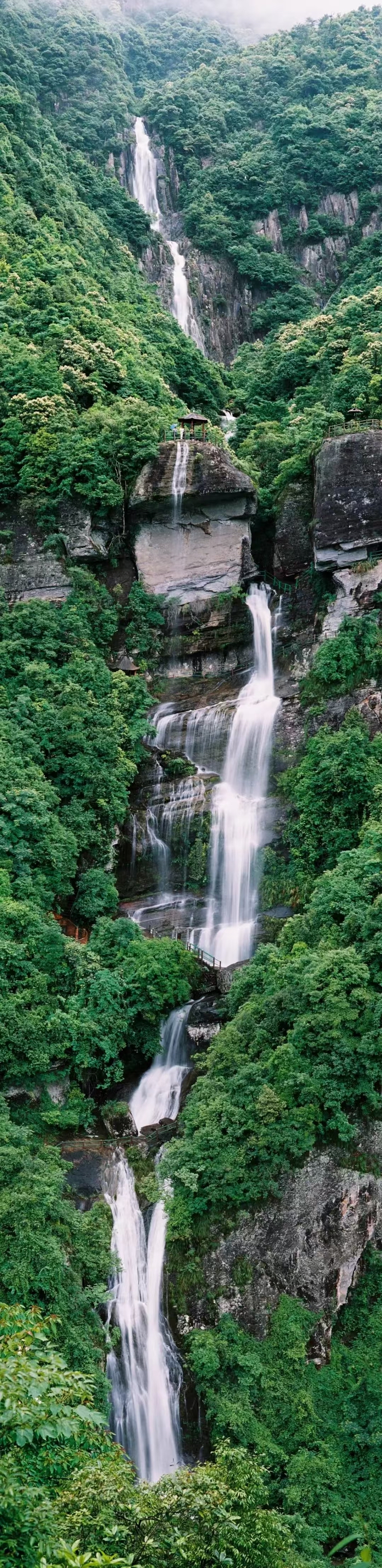 青云山九天瀑布瀑流如银河倾泻,在崖壁间折转九次,远望似九条玉龙凌空飞舞