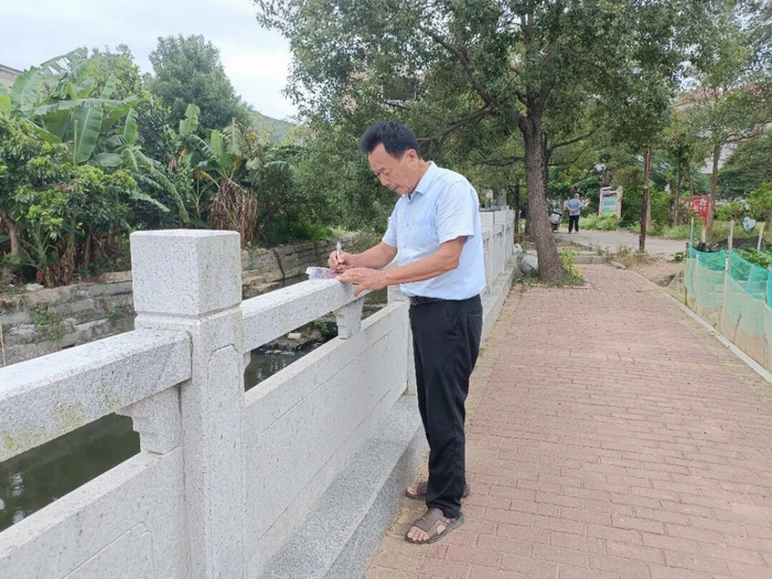 泉港区老兵河长柯世狮巡河时记录巡河日志