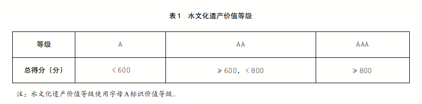 此外,根据总得分将水文化遗产的价值分为三个等级,从高到低依次为AAA级、AA级、A级,等级划分按照表1的规定执行。要特别强调的是,当水文化遗产整体或作为部分已经被列入世界级或国家级重要遗产名录,且水文化价值是其主要价值,可将总体价值直接评为AAA级,这一规定凸显了对已获广泛认可遗产价值的尊重与肯定。