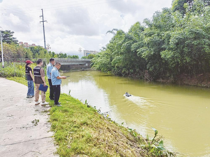 执法人员使用无人船采集水样进行水质监测